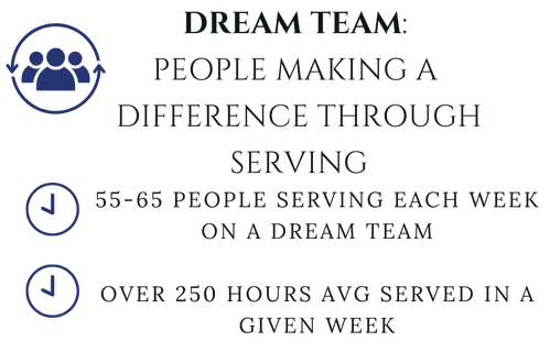 We give because God first gave to us. Jesus did not come to be served, but to serve. God has a unique place where you can use your abilities and passions. Serving alongside others on the Dream Team gives you the opportunity to be used by God, to impact the lives of others.
